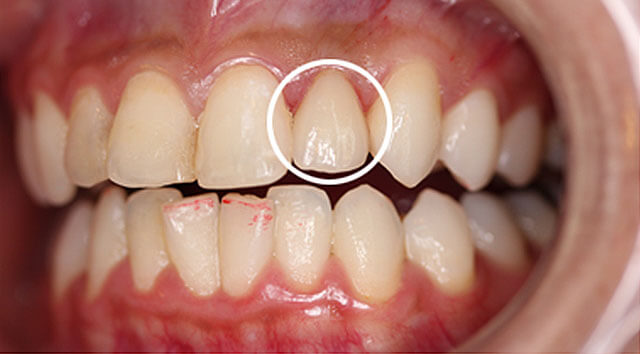 そこに形調整用の歯を入れます。形合わせ専用の特殊材料を使っていますので、色は少し黄色いです。